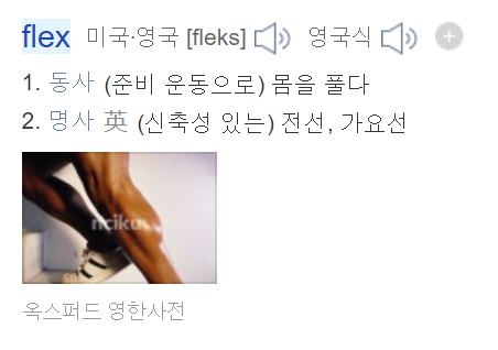 flex 영어단어적 의미로는 동사로 "(준비운동으로)몸을 풀다" 명사로 "(신축성있는)전선,가요선(?) 이라고 표기되어 있습니다. 우리가 흔히 알고 의미부여하며 사용하는 말하고는 조금 차이가 있어 보이는 듯 합니다. 워낙에 신조어가 많이 생겨나는 요즘이라서 그런건지 우리나라 국어사전이나, 영어 사전으로의 뜻하고는 차이가 있습니다.