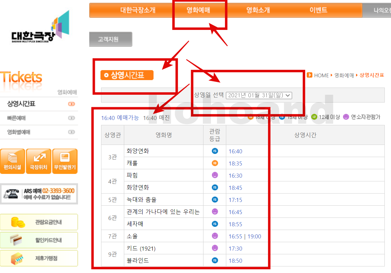 대한극장 홈페이지에 보면 상단 카테고리 구분에 영화 예매가 있습니다. 그부분을 클릭하면 상영시간표를 선택할 수 있는데 영화를 예매할 날짜를 조회하면 그 날짜에 상영중인 영화명, 관람등급, 상영시간이 한눈에 볼 수 있게 나와있습니다.