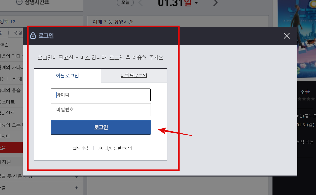 영화를 예매 하기 위해서는 로그인을 해 주어야 하나 비회원로그인을 통해서 굳이 회원가입 절차 없이도 빠른 예매는 가능합니다.