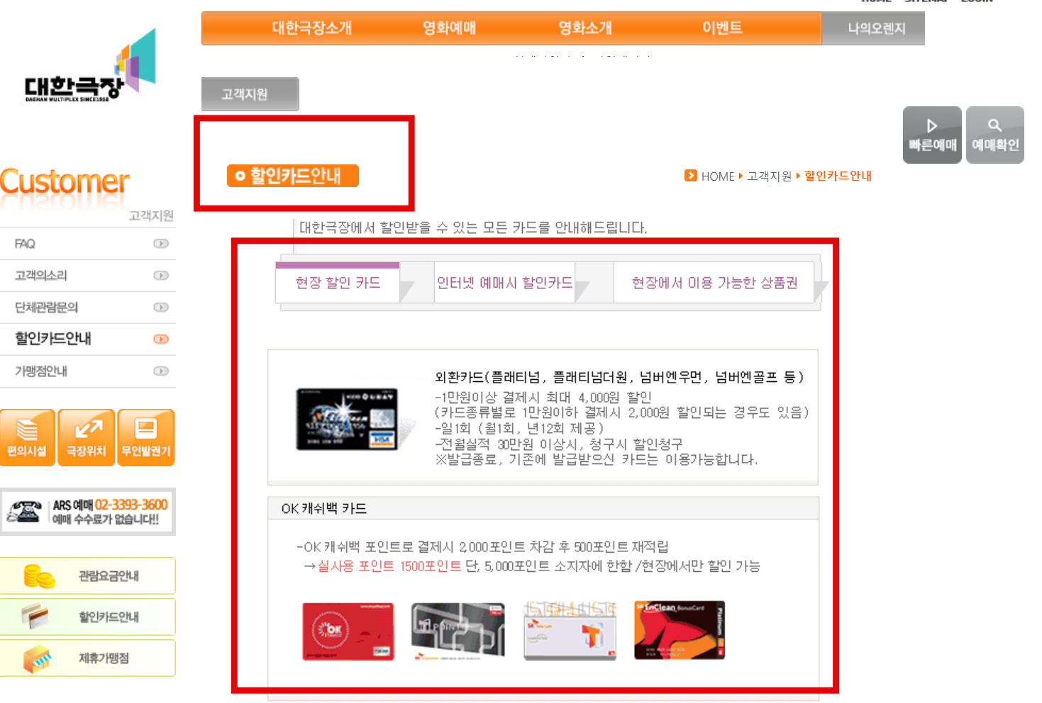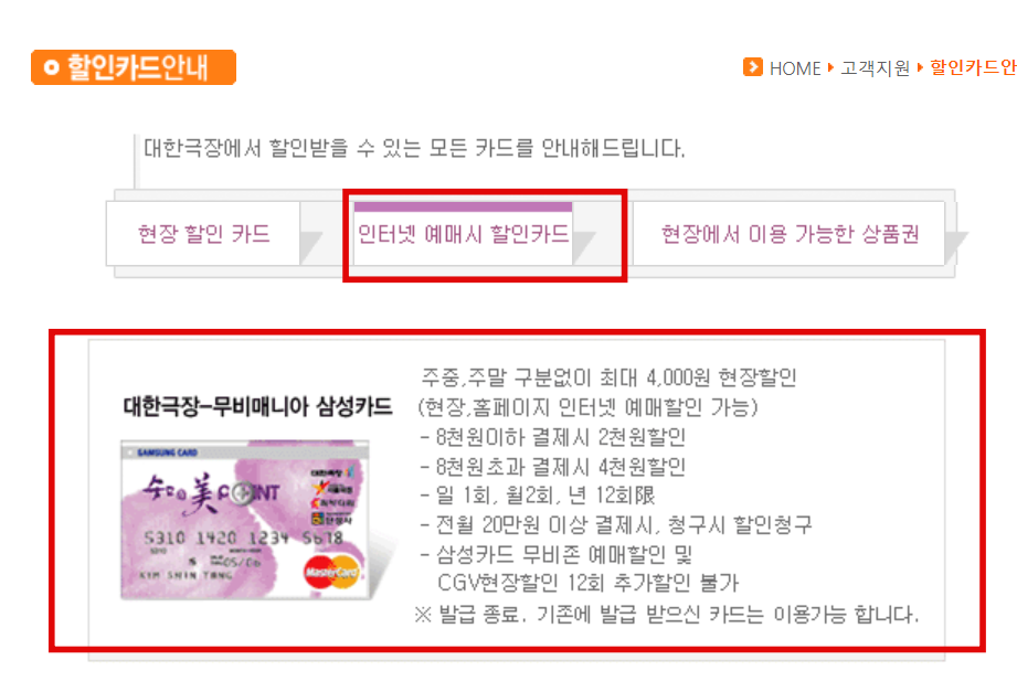 인터넷 예매시에는 삼성카드 종류인 무비매니아 카드가 있습니다.