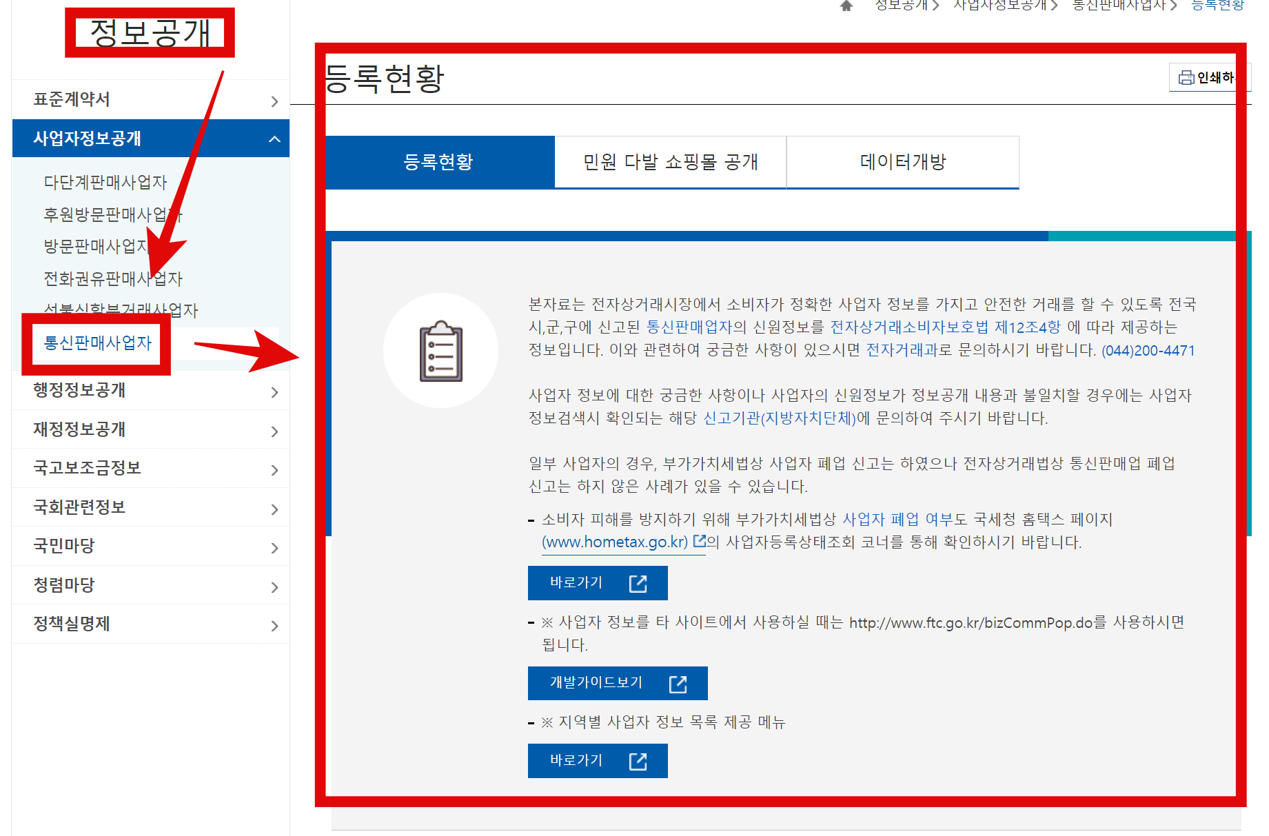 정보공개 탭에서 통신판매사업자로 넘어가게되면 등록현황 페이지가 바로 나옵니다. 자료제공에 대한 설명이 쭉 나오고 하단으로 더 내려가 봅니다.