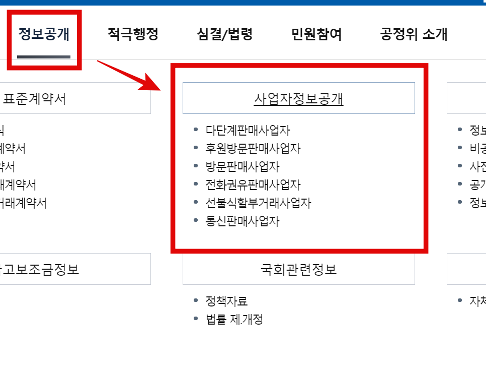정보공개 탭에 마우스를 올려놓으면 사업자정보 공개가 나옵니다.