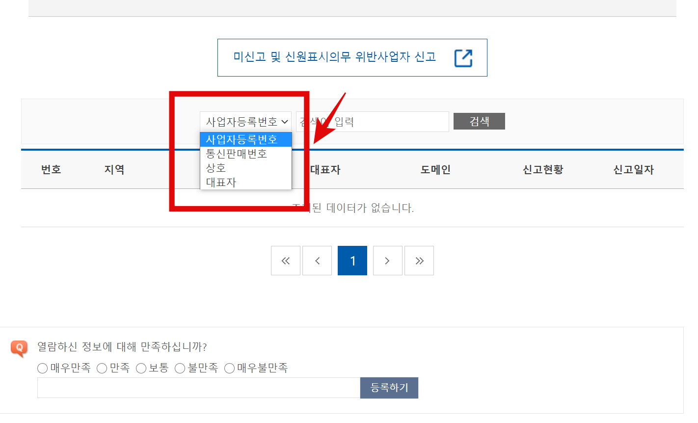 하단부분에 내려오면 사업자등록번호옆 하단 화살표를 누르면 통신판매번호,상호,대표자 각각 조회가능한 범위를 설정해서 조회 할 수 있습니다.