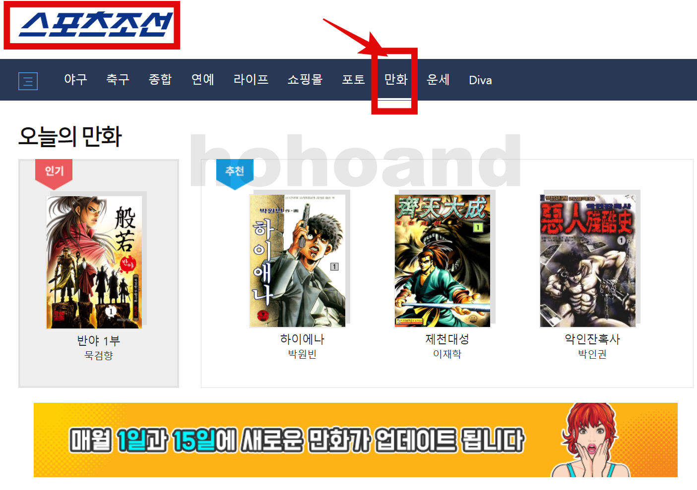 주요 작품들은 매달 내용이 달라질 수 있으니 읽고 싶은 만화가 있다면 새로 업데이트되어 바뀌기 전에 다 읽어줘야 합니다. 스포츠조선 무료만화는 매월 1일과 15일에 업데이트 됩니다.