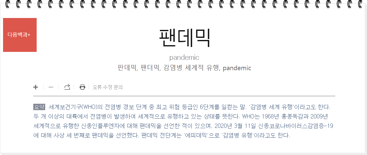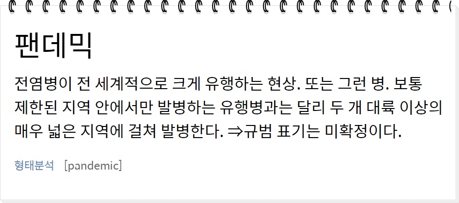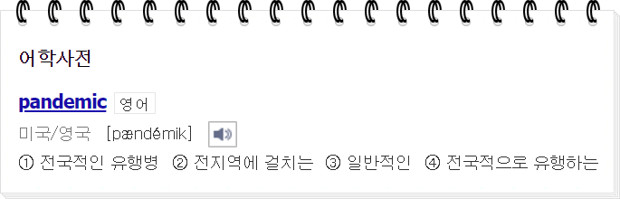 Pandemic 단어에서 Pan은 그리스어로 '모두'라는 뜻이며 demic은 '사람'을 의미하는데 결국 모든 사람들에게 유행하는 전염병이라는 뜻을 가지고 있습니다. 즉, 팬데믹은 '특정 질병' 또는 '전염병/감염병'의 전 세계적 유행이라는 뜻입니다.