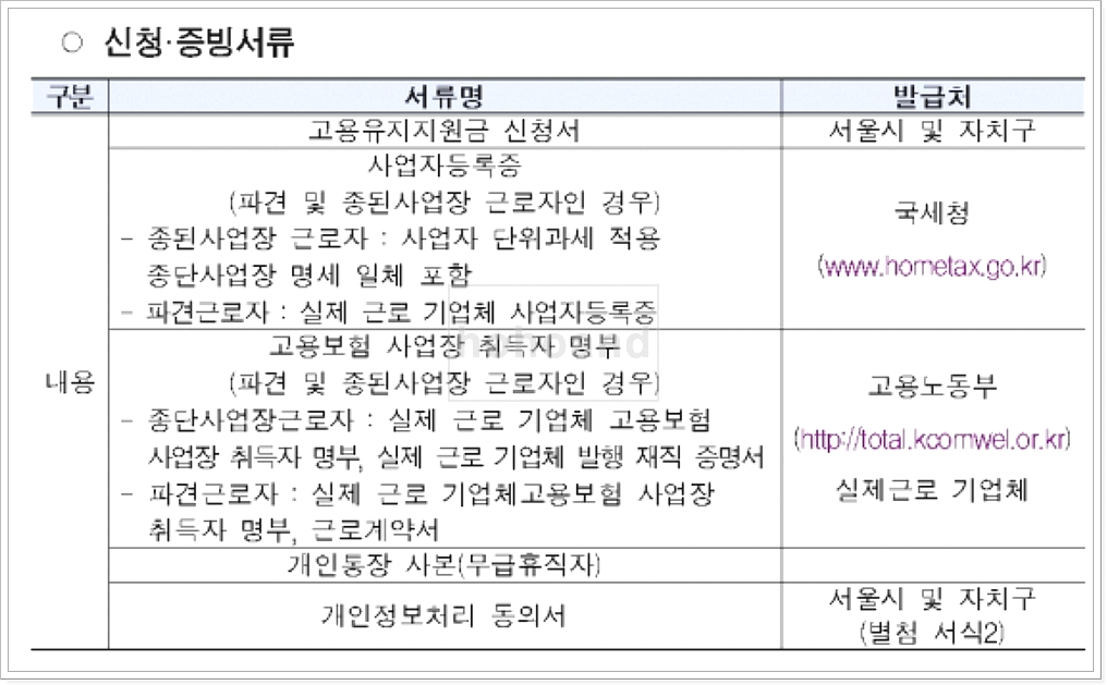 고용유지지원금 신청서는 서울시 및 자치구에서 발급받을 수 있으니 위 자료를 참고해서 증빙서류를 준비하신뒤 신청/접수 하시면 될 것 같습니다.