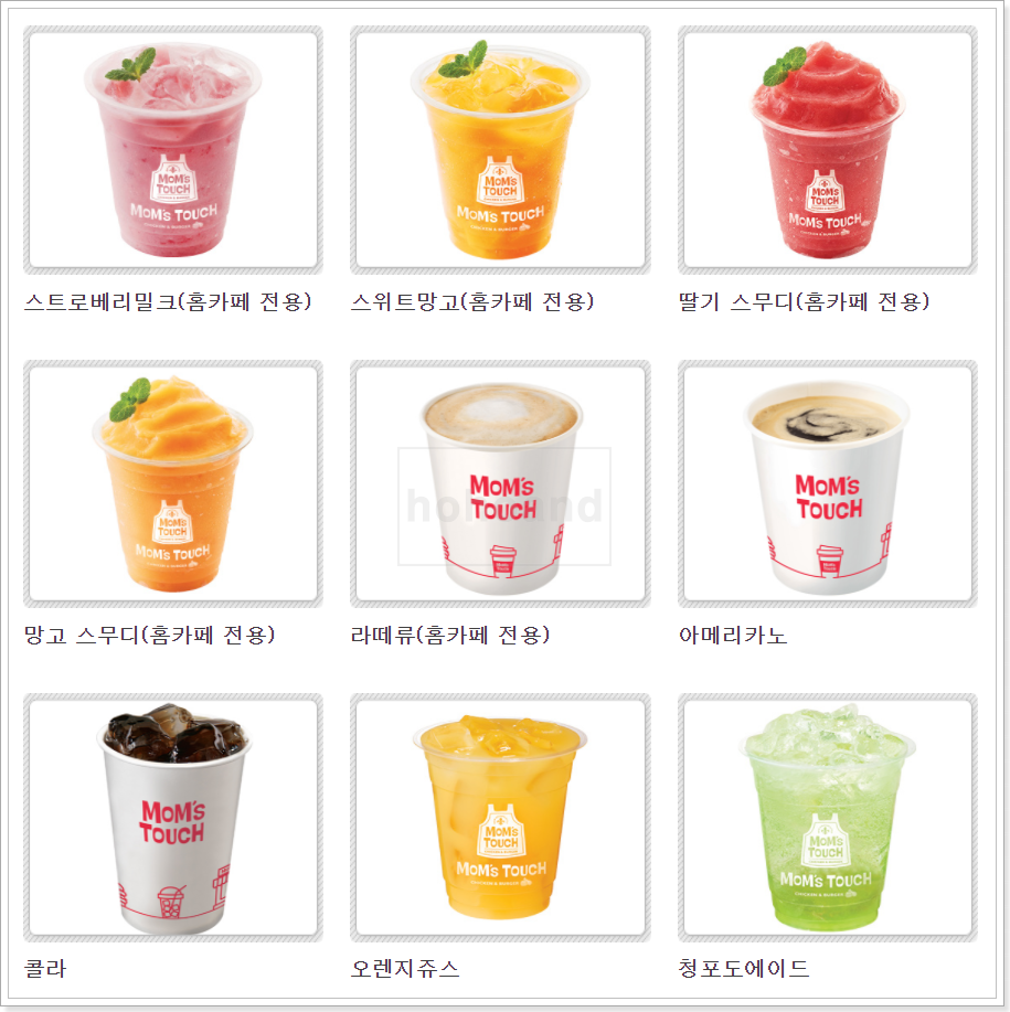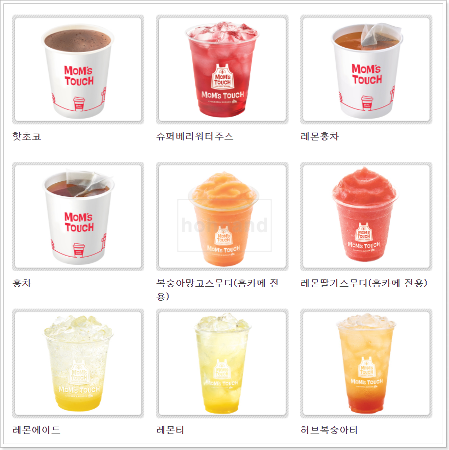 맘스터치의 메뉴는 크게 치킨/버거/사이드/음료 4가지로 나눌 수 있습니다.