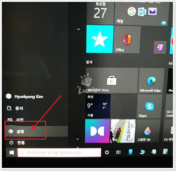 노트북 와이파이 어댑터 드라이버 해결방법은 윈도우 모양의 시작버튼을 열고 컴퓨터 "설정"으로 들어갑니다.