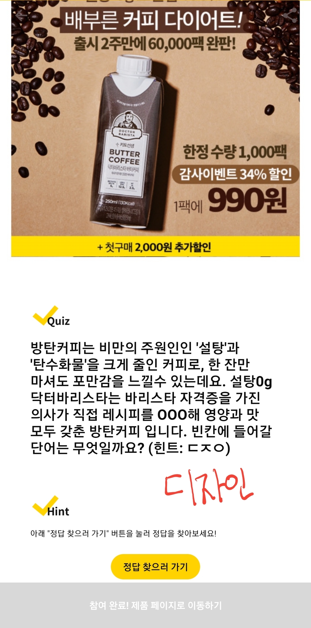방탄커피는 비만의 주원인인 '설탕'과 '탄수화물'을 크게 줄인 커피로, 한 잔만 마셔도 포만감을 느낄 수 있는데요. 설탕0g 닥터바리스타는 바리스타 자격증을 가진 의사가 직접 레시피를 000해 영양과 맛 모두 갖춘 방탄커피 입니다. 빈칸에 들어갈 단어는 무엇일까요? 힌트 ㄷㅈㅇ
